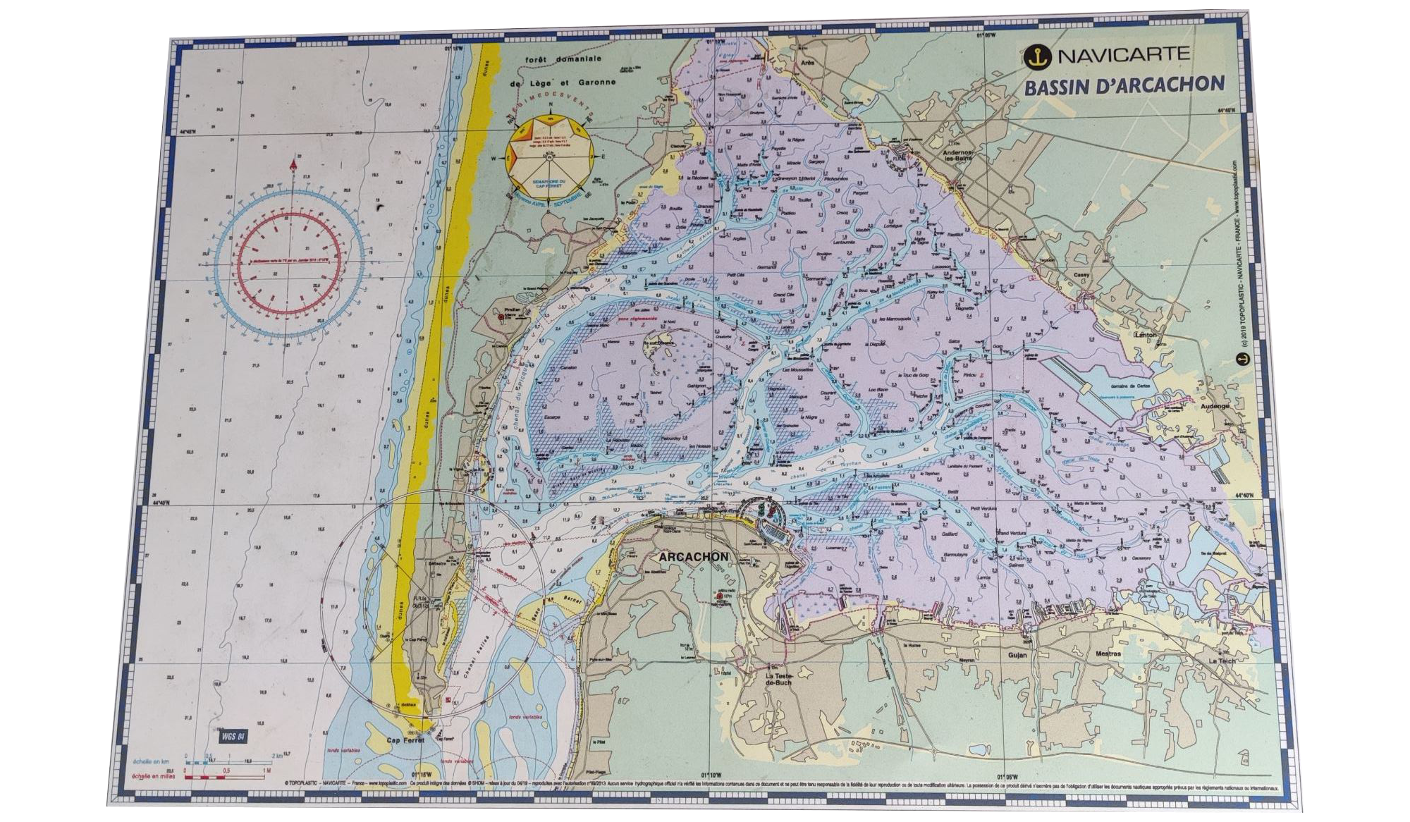 Cette carte nautique du Bassin d’Arcachon illustre à merveille ce lagon naturel unique, situé entre la Dune du Pilat et la presqu’île du Cap Ferret. On y distingue les chenaux sinueux qui serpentent entre bancs de sable mouvants, parcs à huîtres, et villages ostréicoles typiques.